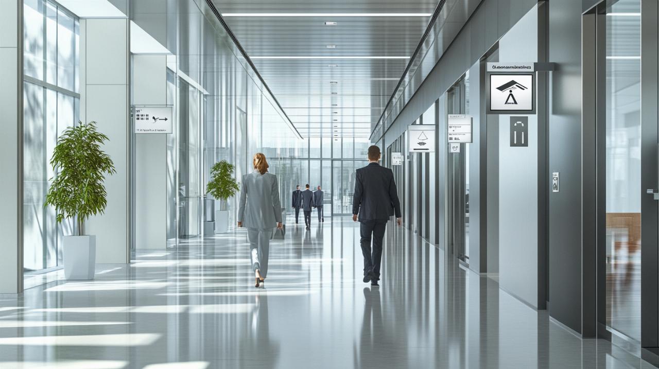 La signalétique directionnelle représente l'épine dorsale d'un parcours visiteur réussi. Elle utilise des flèches, des numéros et des indications précises pour baliser chaque étape du déplacement dans vos locaux. Les panneaux de hall d'immeuble constituent le point de départ de ce parcours en accueillant les visiteurs avec des informations essentielles sur la structure du bâtiment. Cette approche structurée permet non seulement de faciliter l'orientation mais également de réduire le temps que les visiteurs consacrent à chercher leur destination, améliorant ainsi leur perception globale de votre entreprise. La signalétique pour ascenseur complète ce dispositif en indiquant le numéro des étages et ce qui s'y trouve, créant une continuité informationnelle tout au long du parcours.